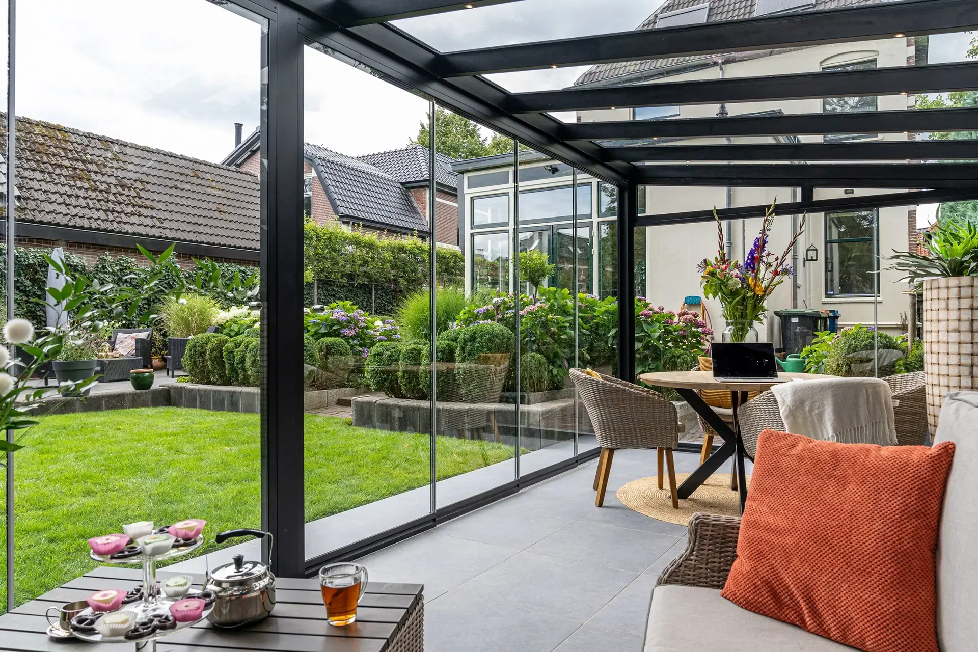 Der Verasol-Händler kümmerte sich um das komplette Projekt – von der Fundamentlegung bis zur Endverarbeitung. Mit einem ebenmäßigen Fliesenboden als Basis fühlt sich dieses Gartenzimmer wie eine vollwertige Erweiterung des Wohnkomforts an. Die Rückwand und eine Seitenwand sind aus perfekt passenden Vollaluminium-Paneelen gefertigt, was Schutz und Privatsphäre bietet.