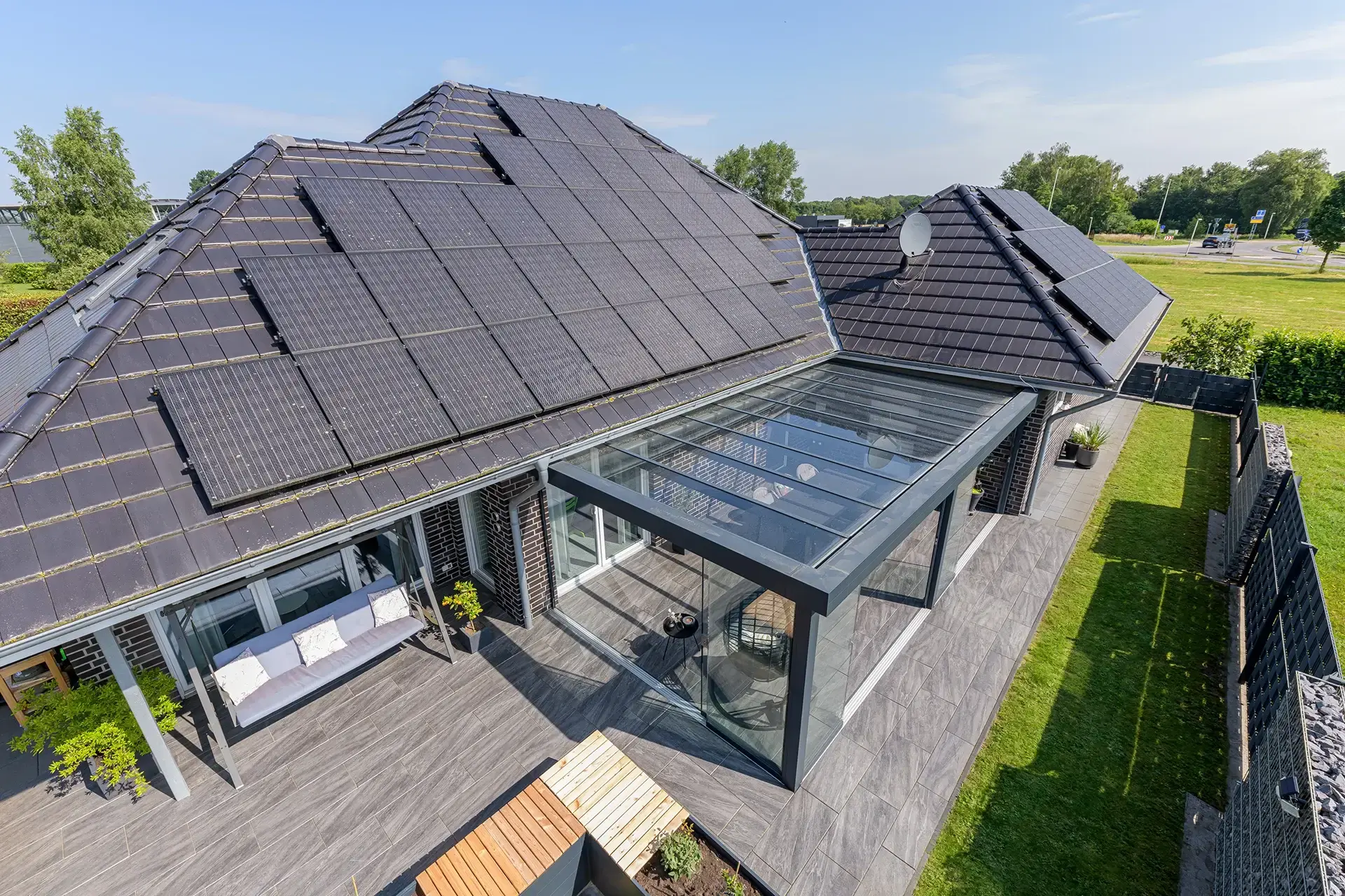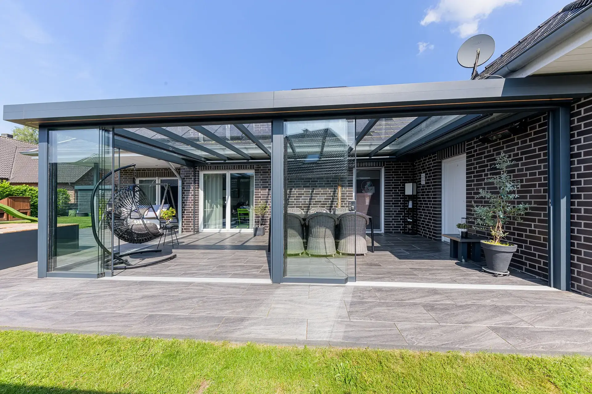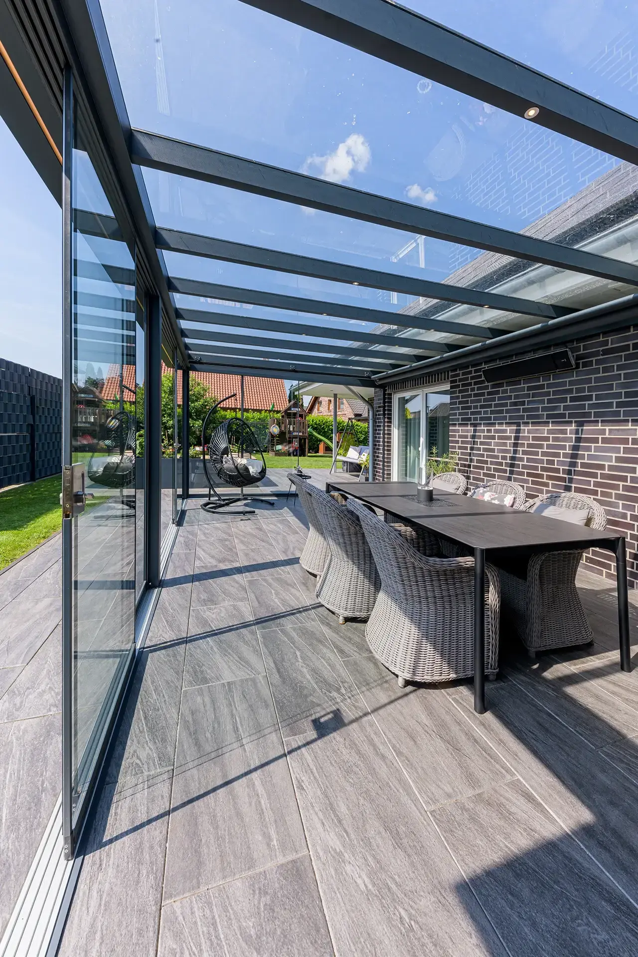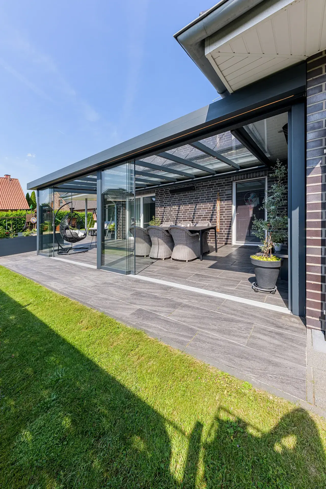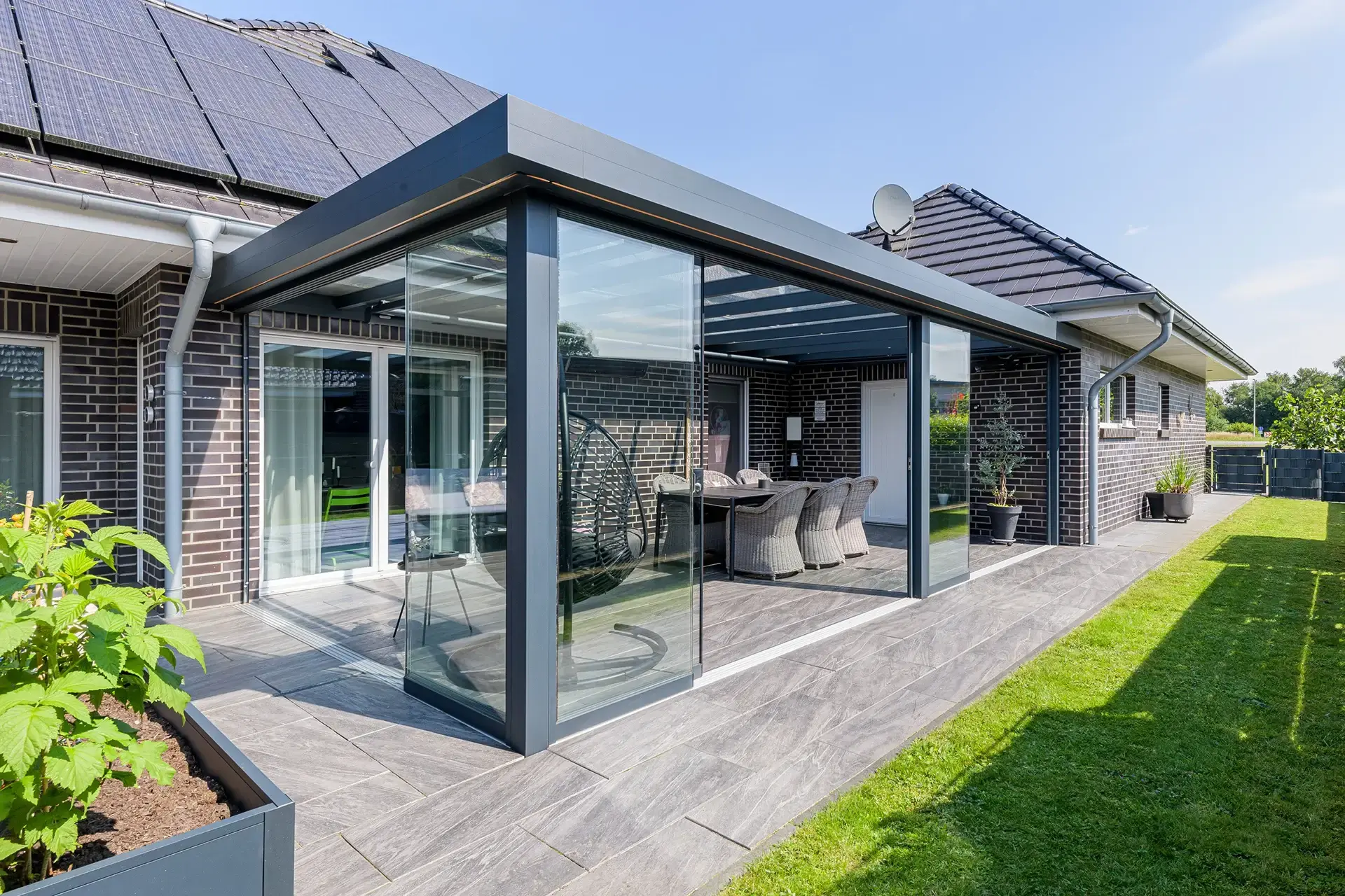 Die Glasschiebewände rundum sorgen für ein offenes Raumgefühl und gleichzeitig für Schutz. Die integrierte Unterdachmarkise hält die Sonne an heißen Tagen fern und sorgt zugleich für ein angenehmes Innenklima.